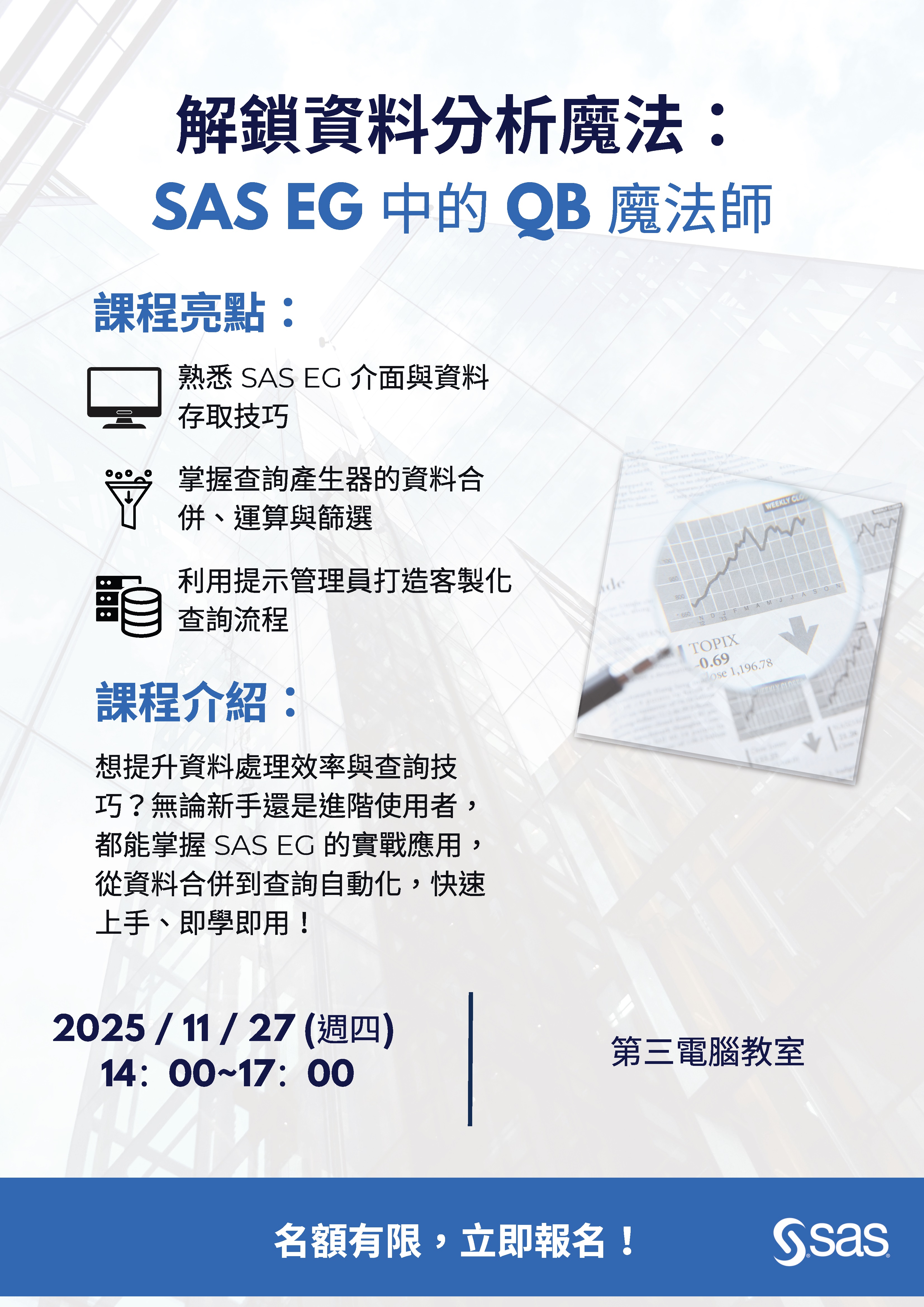 簡介SAS EG的環境介面,並介紹EG中的查詢產生器。 透過查詢產生器進行資料合併、新欄位的計算與彙總、篩選與排序, 最後搭配提示管理員建立客製化的查詢。